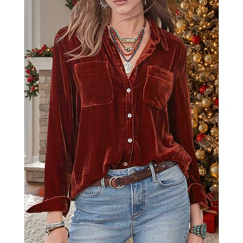 Per donna Camicia Velluto Blusa Semplice Elegante Manica Lunga Colletto a Camicia Top Regolari Ferie Uscire Bottoni Blu Vino Verde militare Primavera Autunno