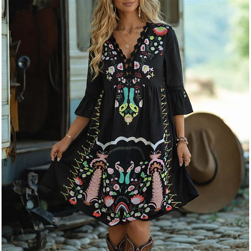 Per donna Vestito longuette Abito casual Abiti Boho Chic Abito boho Boemia Informale Boho Da mare Giornaliero Spiaggia Morbido Pop art Manica lunga A V Nero Rosso Verde Albicocca Estate Primavera