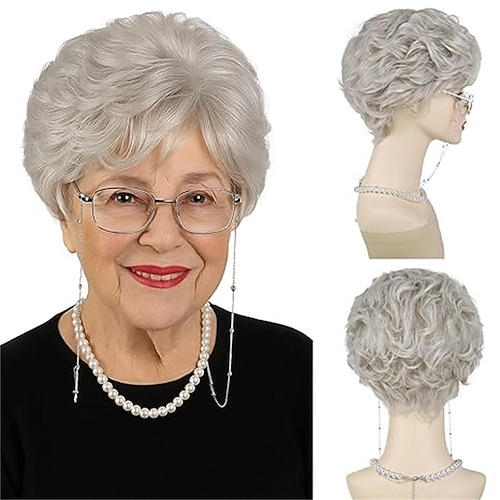 parrucche corte con taglio pixie per donne anziane, parrucca con capelli grigio argento a strati con frangia, parrucche sintetiche ondulate e ricce per vecchie signore, festa quotidiana, nonna
