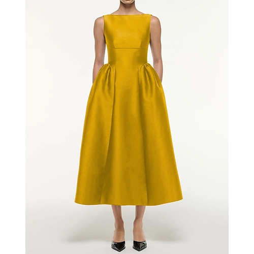 Linea ad A Lunghezza Tè Abiti da Cocktail Abiti da festa Elegante Senza Maniche Scollo a Barca Festa in giardino Matrimonio Raso con Pieghe Tasca