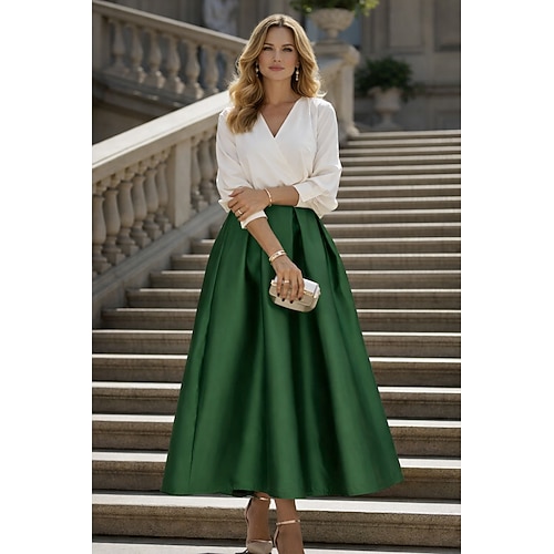 Due Pezzi Lunghezza Tè Abiti da Cocktail Abiti da festa Elegante Monocolore Manica Lunga Scollo a V Matrimonio Abbigliamento da Festa Raso con Pieghe