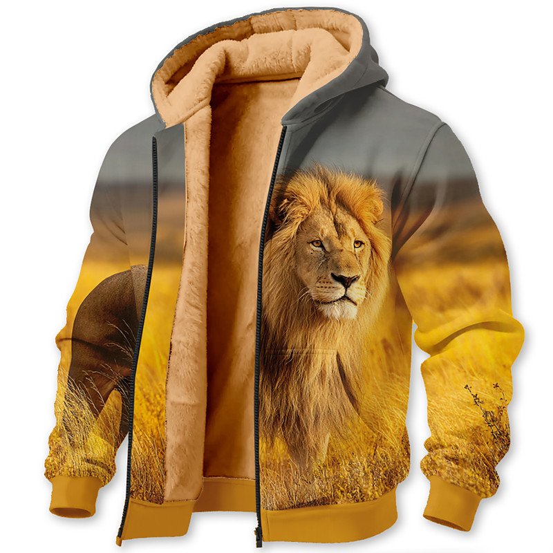 Men's Lion 3D Fleece Hoodie Jacket Sweatshirt Classic Military Hunting Crew Neck Outdoor Camping Yellow Zip Up Fall Winter Designer S M L XL 2XL 3XL