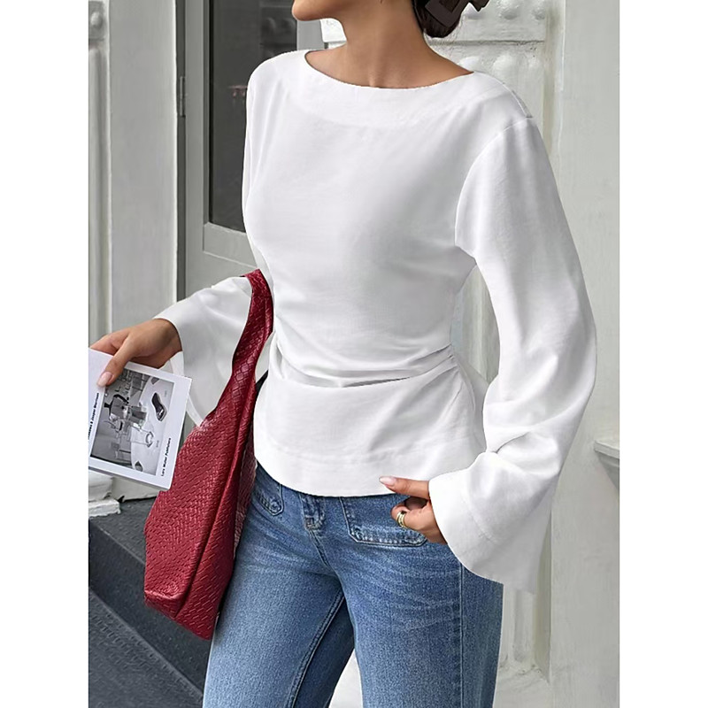 Women's T Shirt Solid Color Stylish Casual Long Sleeve Bell Sleeves Boat Neck Regular Tops Daily Going out Weekend Tunic Black White Brown Spring Fall