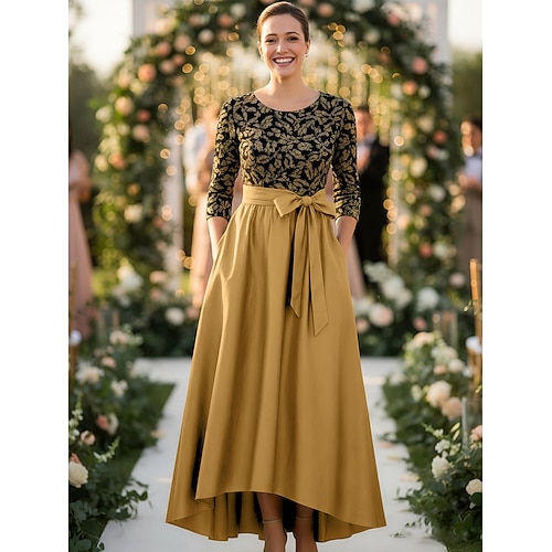 Linea ad A Asimmetrico Abito in Raso Perline ricamate Vestito da Festa Abito da cerimonia per signora Manica 3/4 Girocollo Elegante Formale Ferie Semi-Formale Raso con Fiocco/Fiocchi