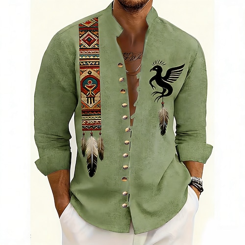 Herren Ethnisch Thunderbird Feder der amerikanischen Ureinwohner Hemd Stehkragenhemd Langarm Vintage-Retro Lässig Urlaub Frühling Herbst Mandarinkragen Stehkragen 3D-Druck Button-Down Leinenähnliches