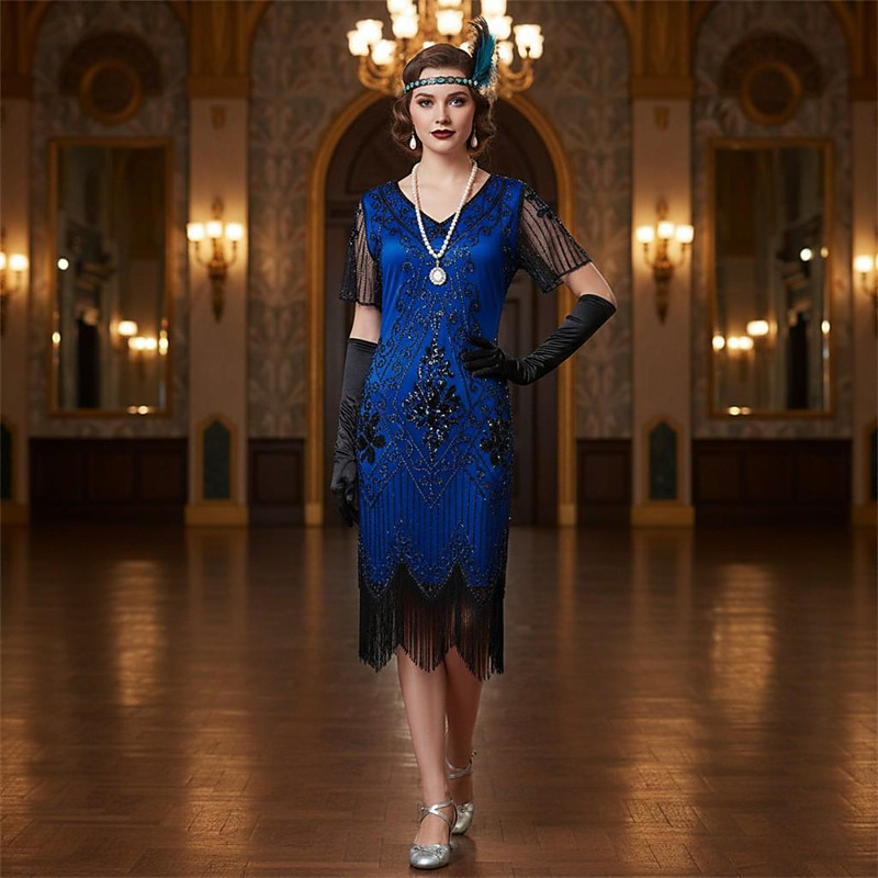 Roaring 20s 1920s Cocktail Dress Midi Flapper Dress Cocktail Dress Accesories Set Short Sleeves The Great Gatsby Wedding Guest Sequins Tassel Fringe V Neck Fancy Dress Women's Masquerade Party