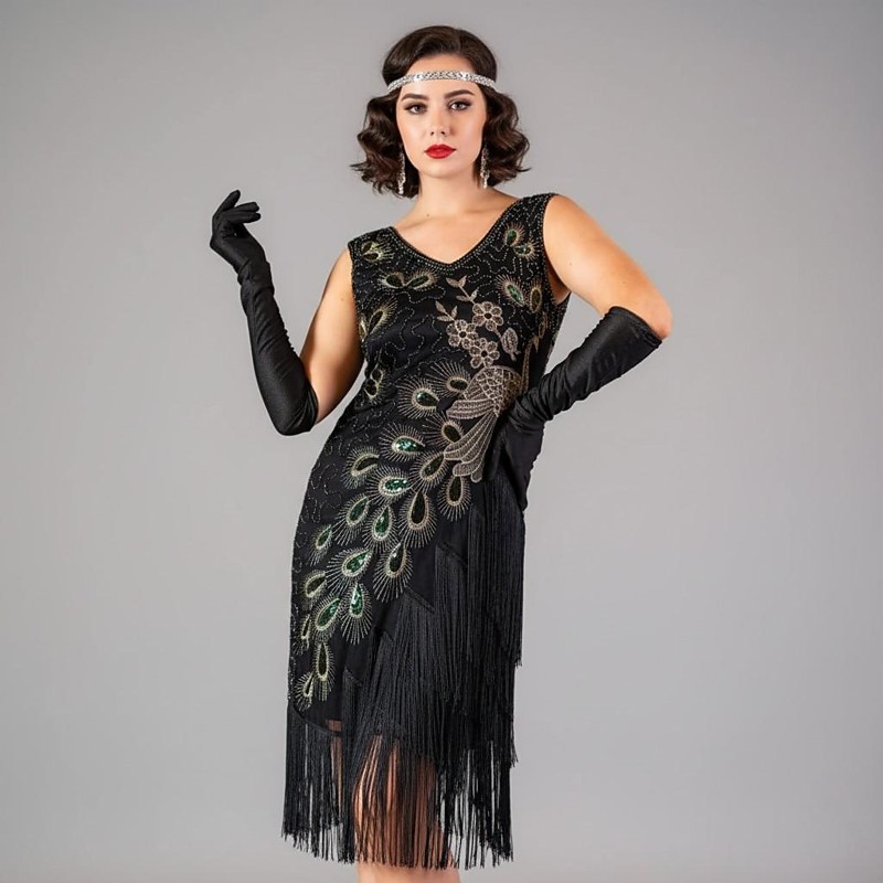 Retro Vintage Roaring 20s 1920s Knee Length Flapper Dress Dress Fancy Costume Plus Size Sleeveless The Great Gatsby Charleston Sequins Tassel Fringe Feather V Neck Fancy Dress Women's Carnival New
