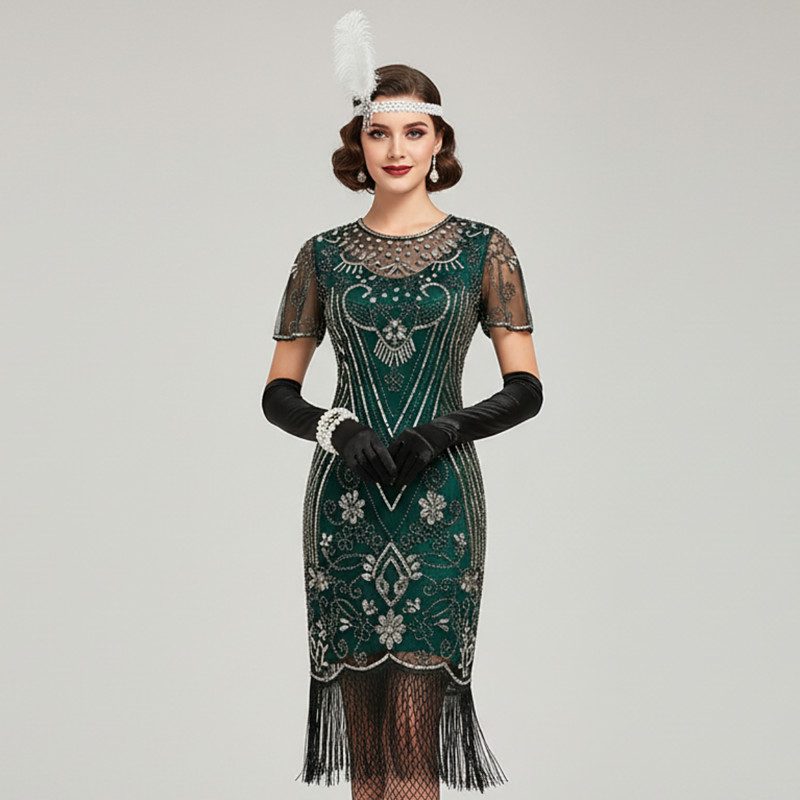 Set Roaring 20s Vintage Inspired The Great Gatsby Knee Length Short Length Flapper Dress Outfits Party Costume with Accessories Illusion Sleeve Short Sleeves The Great Gatsby Wedding Guest Sequins