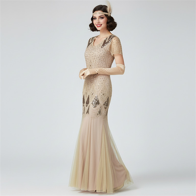Retro Vintage Roaring 20s 1920s Floor Length Dress Christmas Party Dress Evening Dress Short Sleeves The Great Gatsby Wedding Guest Sequins V Neck Fancy Dress Women's Carnival Masquerade Wedding