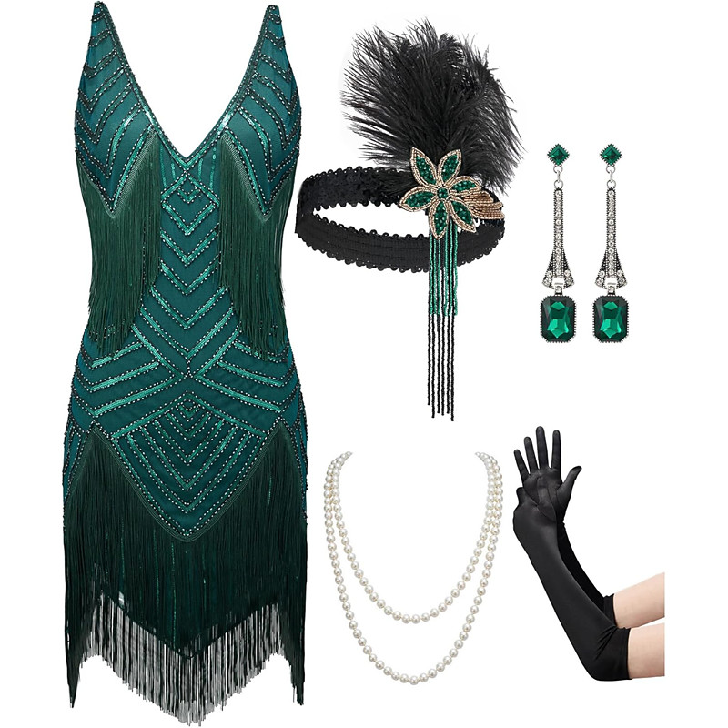 Set Roaring 20s 1920s Cocktail Dress Knee Length Flapper Dress Dress Outfits with Accessories Sleeveless The Great Gatsby Charleston Sequins Tassel Fringe Feather V Neck Fancy Dress Women's Carnival