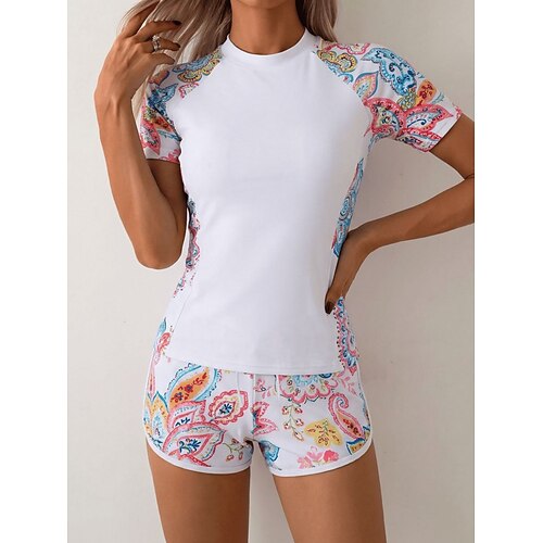 Per donna Costumi da bagno Tankini Due pezzi Shorts Costume da bagno Controllo della Pancia Vita alta Snello Senza schiena Vacanza Abbigliamento da Spiaggia Grafico Collo Alto Maniche Corte Costumi