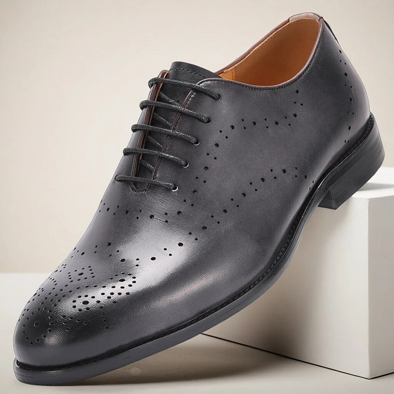 Men's Black Leather Dress Shoes – Classic Design with Perforated Detailing, Perfect for Formal and Wedding Occasions
