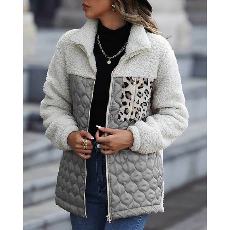 Women's Fleece Jacket Coat Warm Comfortable Patchwork Zipper Pocket Fashion Modern Casual Leopard Going out Weekend Zipper Regular Turndown Regular Fit Long Sleeve Outerwear Black Wine Army Green