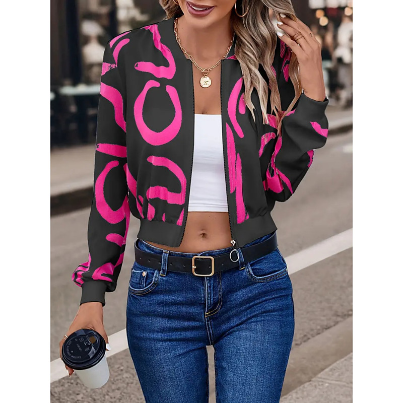 Women's Casual Jacket Comfortable Breathable Zipper Print Casual Street Style Geometric Vacation Street Casual Daily Wear Zipper Short Stand Collar Loose Fit Long Sleeve Outerwear Black White Fuchsia