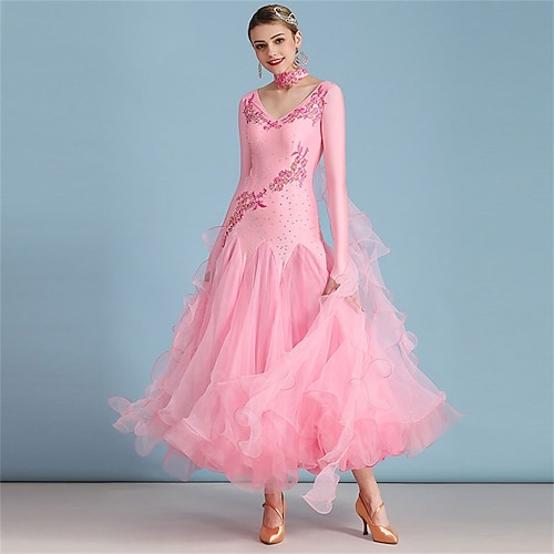 abito da ballo da sala da donna, elegante abito da competizione per valzer foxtrot, in organza con strass floreali rosa a strati