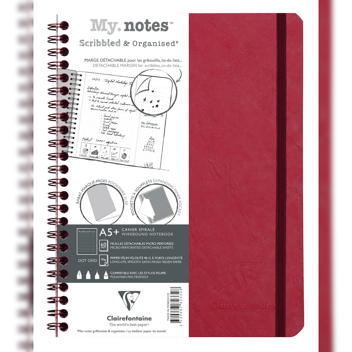 Clairefontaine 5x My.Notes Age Bag, Spiralheft A5+, 60 Blatt 90g, DOT mit Kopfleiste, abtrennbar, mikroperforiert - Rot 782332C