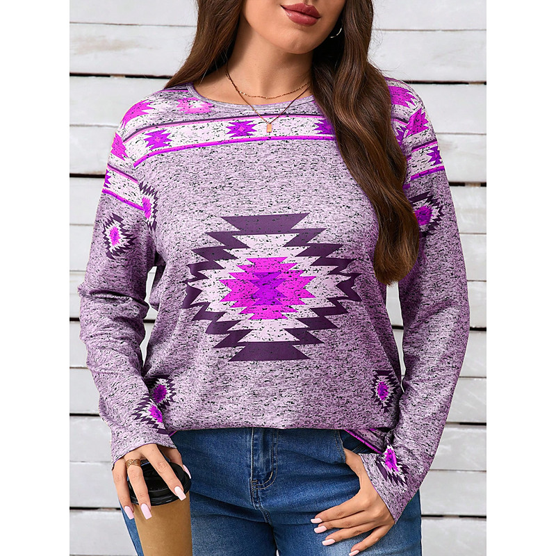 Women's Plus Size Tops T Shirt Geometry Print Long Sleeve Crew Neck Casual Daily Polyester Fall Winter Blue Purple