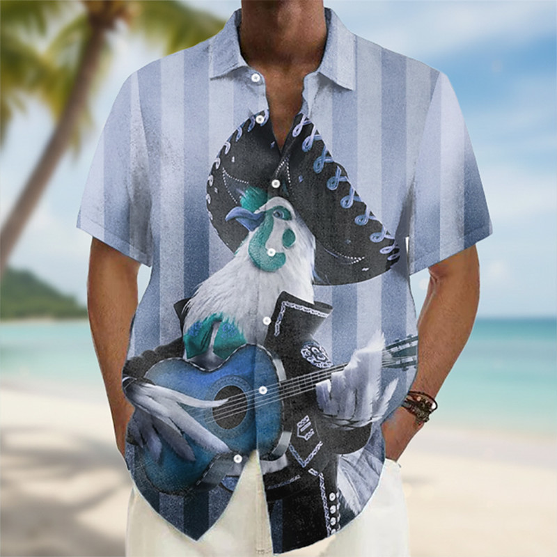 Men's Rooster Funny Guitarist Player Shirt Button Up Shirt Short Sleeve Vintage Retro Outdoor Holiday Summer Spring Turndown 3D Print Collared Shirts Blue Khaki
