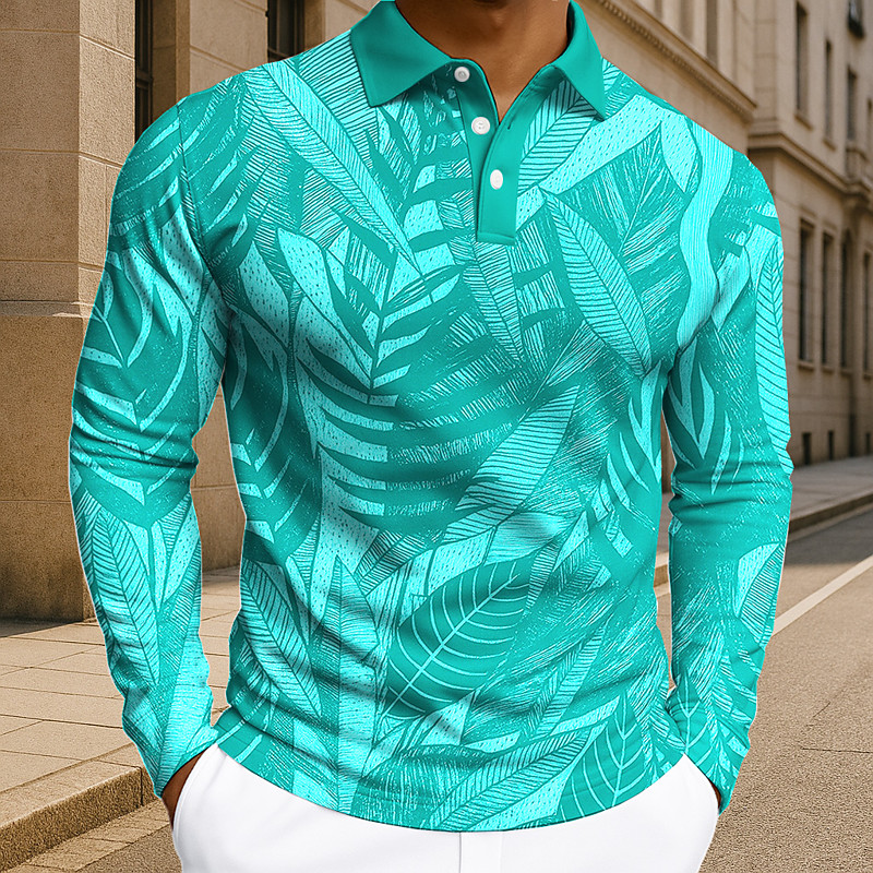 Men's Plants Leaves Polo Long Sleeve Polo Shirts Lapel Casual Athleisure Daily Wear 3D Print Buttons Spring Fall Winter Blue Green Gray