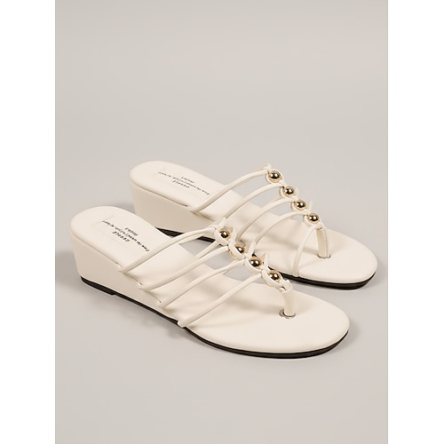 Weiße Zehenstegsandalen mit Keilabsatz für Damen – elegante Strand-Plateau-Flip-Flops im Boho-Stil mit goldenen Perlenriemen für einen stilvollen Sommerurlaub Resort-Kleidung
