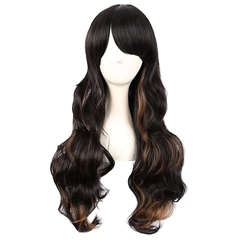 Long Curly Highlight Wig with Curtain Bangs for Women 28 Inch Layered Hair Synthetic Heat Resistant Wig Natural Looking Wigs Daily Use
