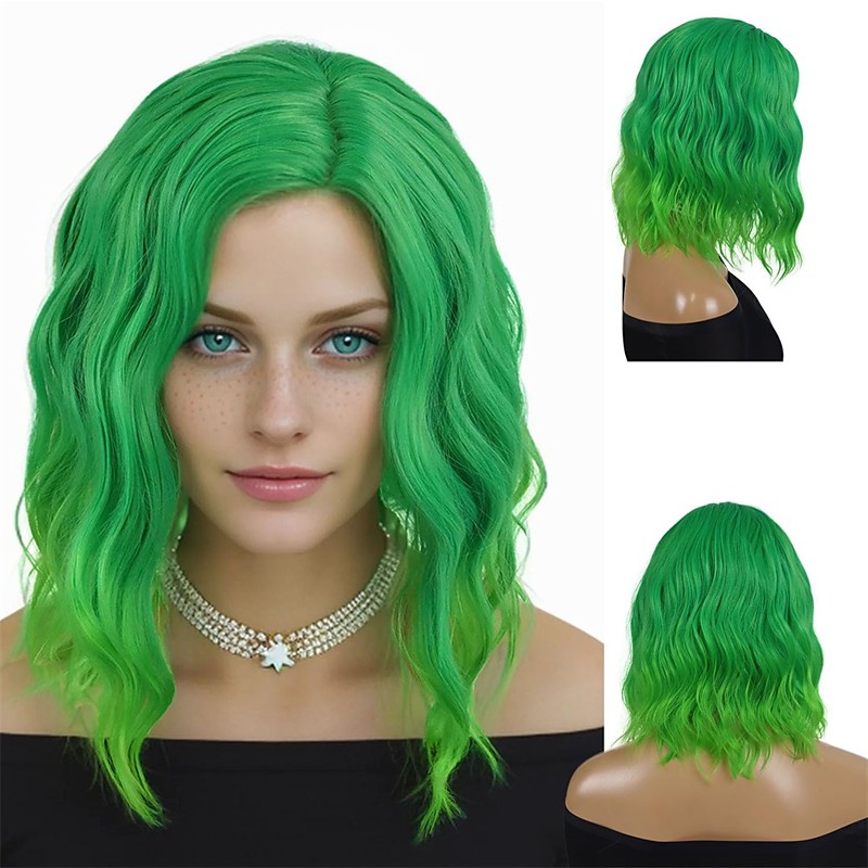 14 Inches Green Ombre Wig with Bangs Women Girls Short Curly Wavy Bob Wig Shoulder Synthetic Carnival Party Wigs St.Patrick's Day Wigs