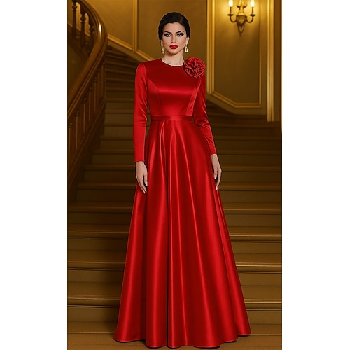 Abito da sera A-Line rosso elegante formale lungo fino al pavimento con maniche lunghe scollo a girocollo in satin stretch con fiore sulla spalla