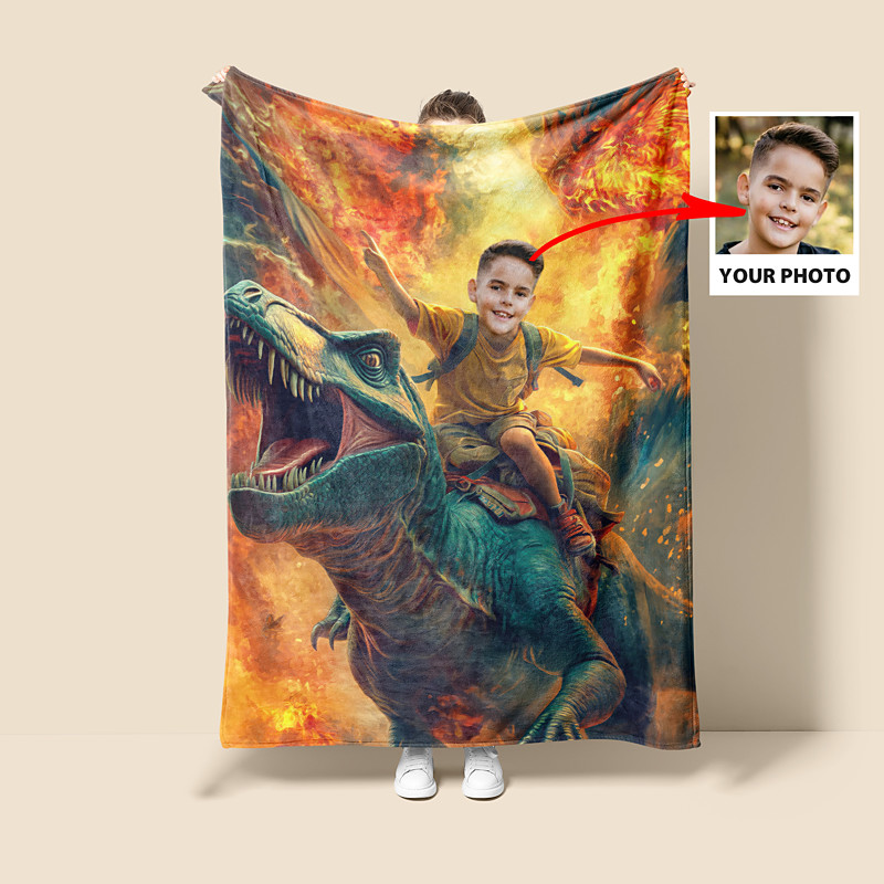 Little Boy Riding Dinosaur Personalized Photo Blanket Customizable Soft and Cozy Throw Features a Fun Dinosaur Design with Your Photo Perfect for Kids' Rooms Gifts or Keepsakes Durable and Comfortab