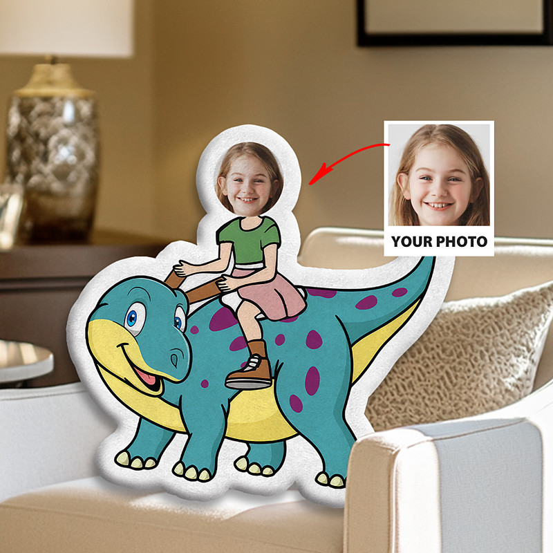 Personalized Photo Face Pillow,Customized Kids Riding Dinosaur Pillows, Birthday Boy Gifts, Funny Ugly Pillow, Custom Shaped Pillow, Stuffed Dinosaur
