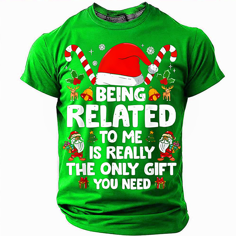 Christmas Funny 'Being Related to Me Is Really the Only Gift You Need' Men's Short Sleeve Crewneck T-Shirt, Holiday Humor Tee, Gag Gift for Dad or Friend