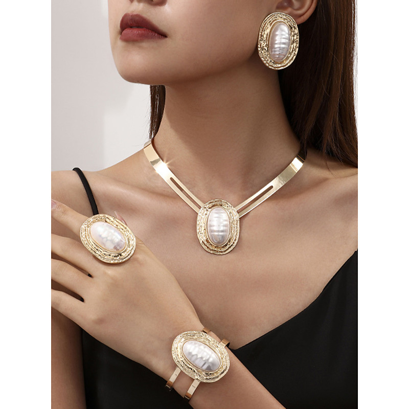Women's Gold Statement Jewelry Set with Imitation Pearls - Vintage-Inspired Necklace, Bracelet, Ring Earrings for Party, Wedding or Evening Events