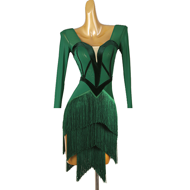 Latin Dance Dress Tassel Women's Performance Training Long Sleeve High Spandex Tulle