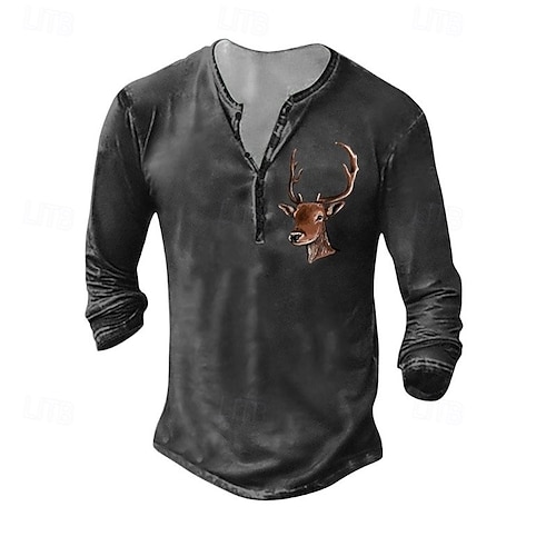 Herren Henley Hemd T-Shirt Langarmshirt Langarm Henley Sommer Herbst Muster Hirsch Mode Designer Mode Jahrgang Urlaub Straße Ausgehen Dunkelgrau Schwarz Weiß Top T-Shirt für Herren