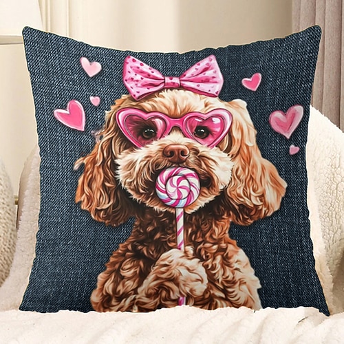 Federa per cuscino con stampa piatta 2D per San Valentino, simpatico cane con occhiali a forma di cuore rosa, che tiene in mano un lecca-lecca rosa, adorabile regalo per San Valentino, federa