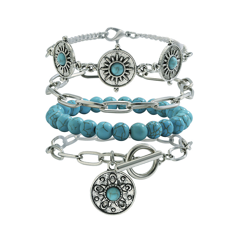 Women's Boho Turquoise Charm Bracelet Set with Leather Wrap and Cactus Pendant, Vintage Western Style Jewelry for Cowgirl Festival Outfits, Parties and Summer Holidays