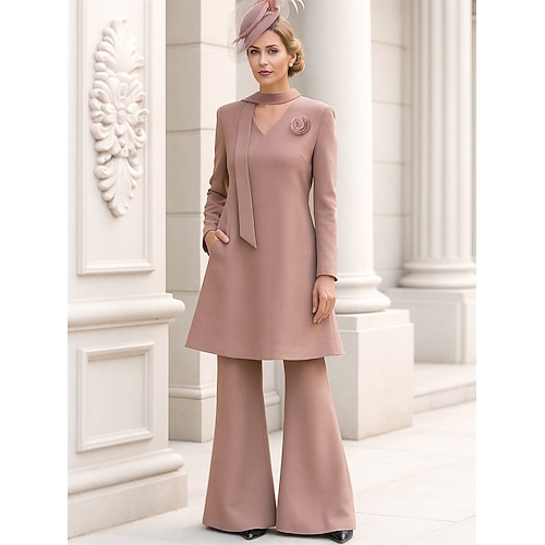 Abito a Due Pezzi Pantalone Abito da Sposa di Lunghezza Piena Abito per Ospiti di Nozze Abito per Madre della Sposa Manica Lunga Collo a V Elegante Semplice Ospite di Nozze Spandex con Fiore Colore