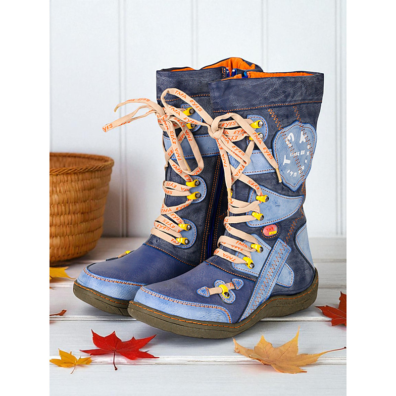 Women's 1950s Vintage Red Embroidered Lace-Up Knee-High Boots with Block Heels – Floral Pattern Leather Boots for Casual Wear and Western Style