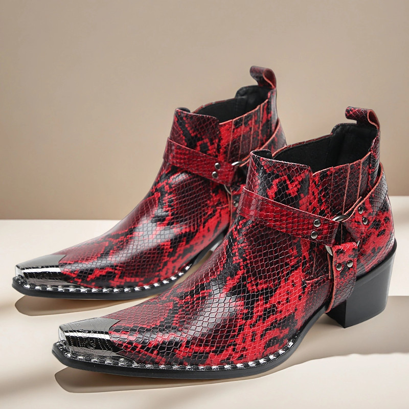 Men's Red Genuine Leather Snake Pattern Western Boots with Pointed Toe and Buckle Strap, 100% Cowhide Cowboy Ankle Boots for Stage, Parties and Fashion Shows