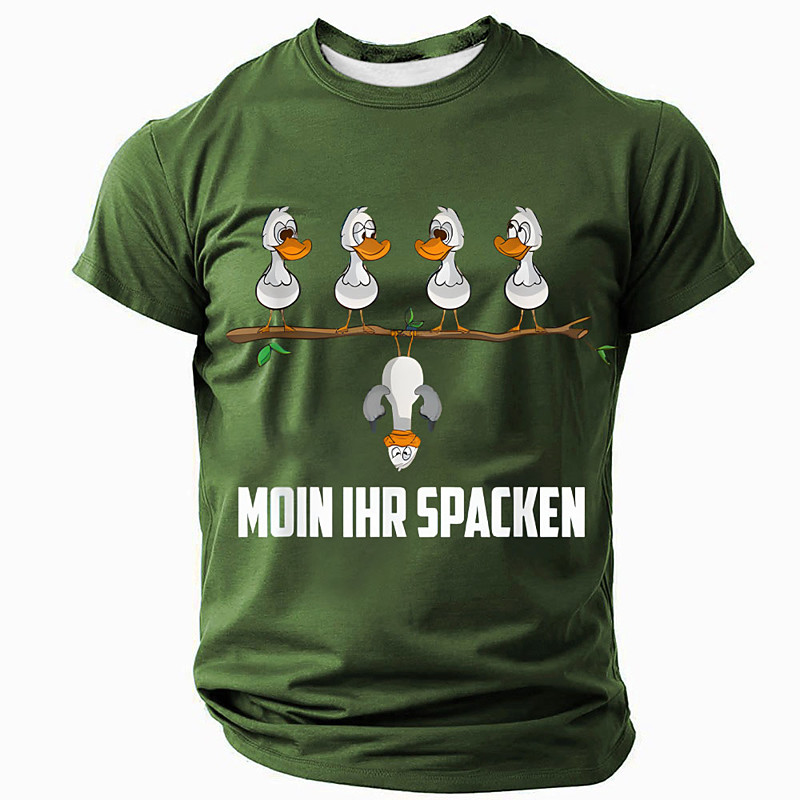 Men's Funny Red Short Sleeve Graphic T-Shirt with German 'Moin Ihr Spacken' Duck Design