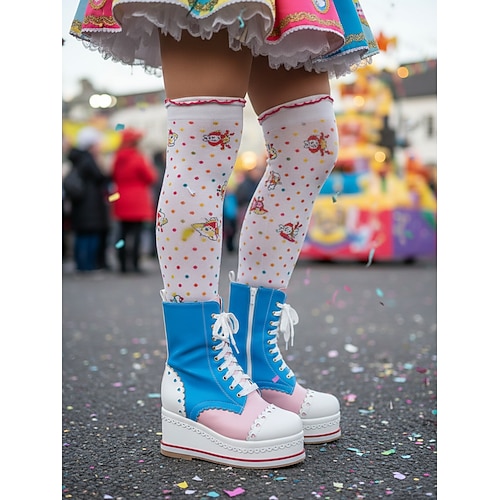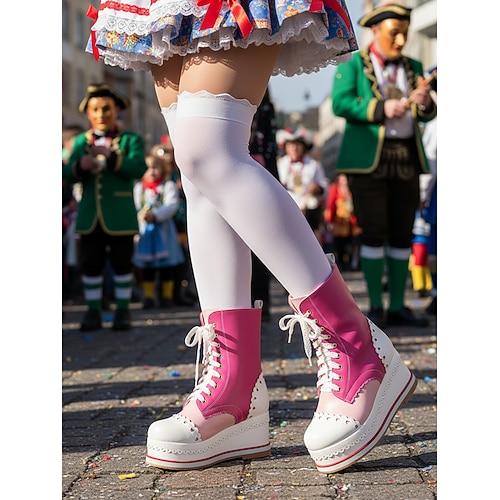 Damenschuhe Mardi Gras mit rose-pinkem Plattform-Wedge-Stiefel mit gewelltem Rand – Süßes Lolita-Stil Schnürschuhe für Anime-Cosplay Karnevalsparaden