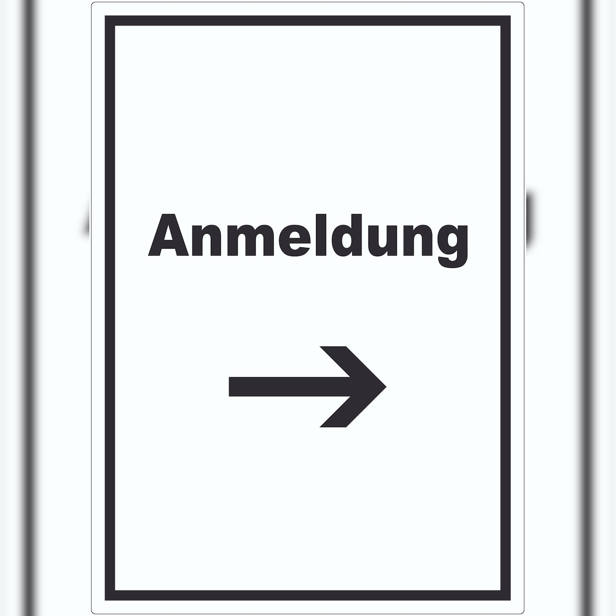 HB-Druck Anmeldung Aufkleber mit Text und Richtungspfeil rechts Aufnahme hochkant A2 (420x594mm)