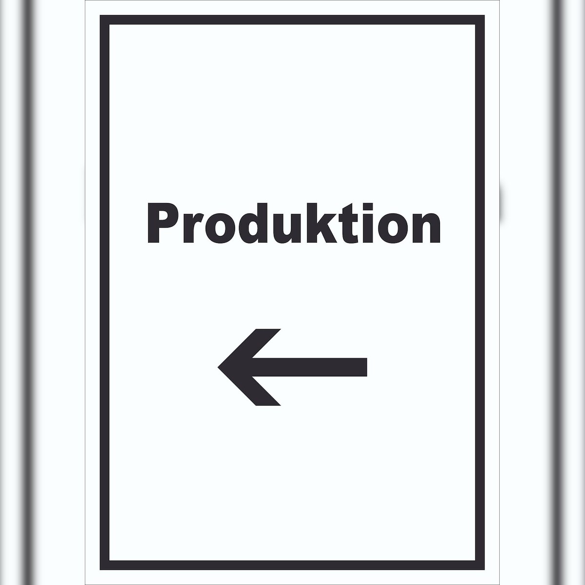 HB-Druck Produktion Schild mit Text und Richtungspfeil links Herstellung hochkant A2 Rückseite selbstklebend