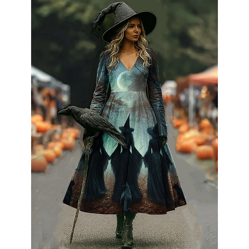 Women's Witch Print Maxi Dress A Line Dress Vacation Casual Boho Beach Regular Fit Floral Graphic Hocus Pocus Long Sleeve V Neck Yellow Dark Green Purple Orange Spring Fall
