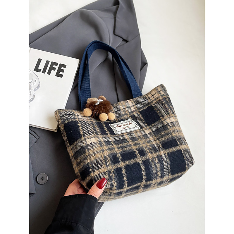 Women's Christmas Plaid Tote Bags – Large Small Sizes, Polyester Fabric with Pom-Pom Charm, Festive Style for Holiday Shopping Gift Giving