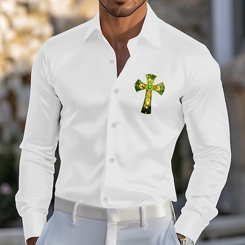 Festa di San Patrizio Per uomo Croce Camicia in raso Camicie Camicia con bottoni Manica lunga Moda Casual Per eventi Estate Primavera Collo ripiegabile Camicie con colletto Stampa 3D Nero Bianco Verde