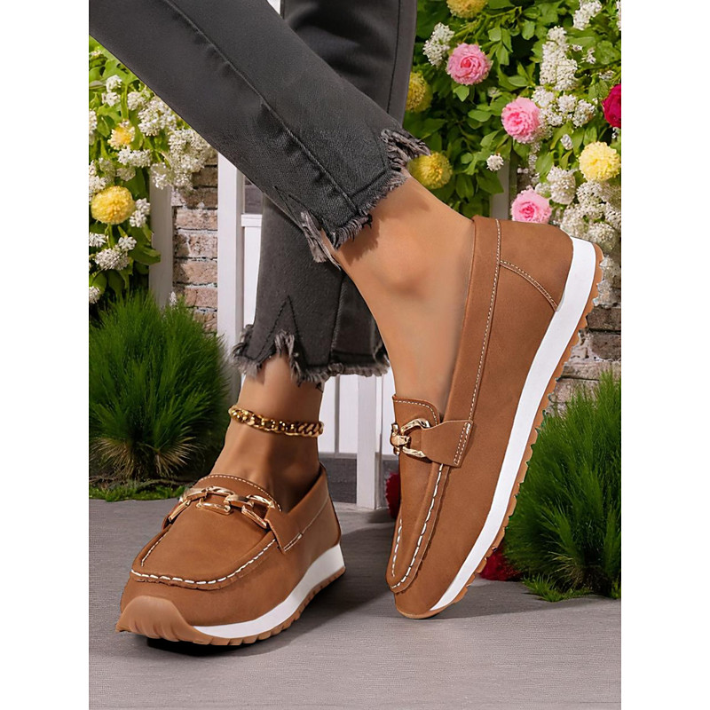 Women's Loafers with Gold Buckle – Casual Slip-On Flat Shoes for Garden Walks, Brunch Everyday Errands
