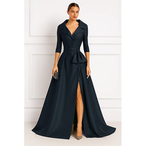 Linea ad A Strascico a Terra Abito da Sera Da principessa Abito formale Elegante Scintillante Stile Celebrità Manica 3/4 Scollo a V Festa in giardino Matrimonio Raso Elasticizzato con Fiocco/Fiocchi
