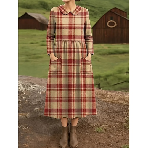 Per donna Abito Midi Tubino Abito Pieghettato Vacanza Casual Boho Ferie Abito Primaverile Vestibilità regolare Plaid Manica Lunga Girocollo Blu Rosso Azzurro cielo Arancione Primavera Autunno