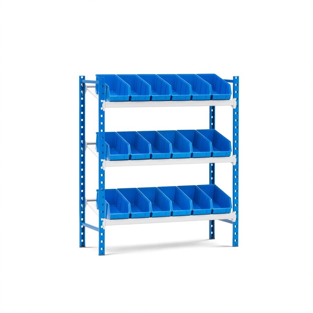 PROREGAL Schrägbodenregal MAXIMUS mit 18x Sichtlagerboxen à 5,6L Fachlast 130kg Grundregal HxBxT 120x100x40cm 3 Ebenen Lichtblau/Lichtgrau
