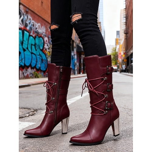 stivali da donna alla moda punk bordeaux con lacci, fibbie e tacchi a blocco metallici: moda urbana alla moda per occasioni casual, di strada e serate fuori